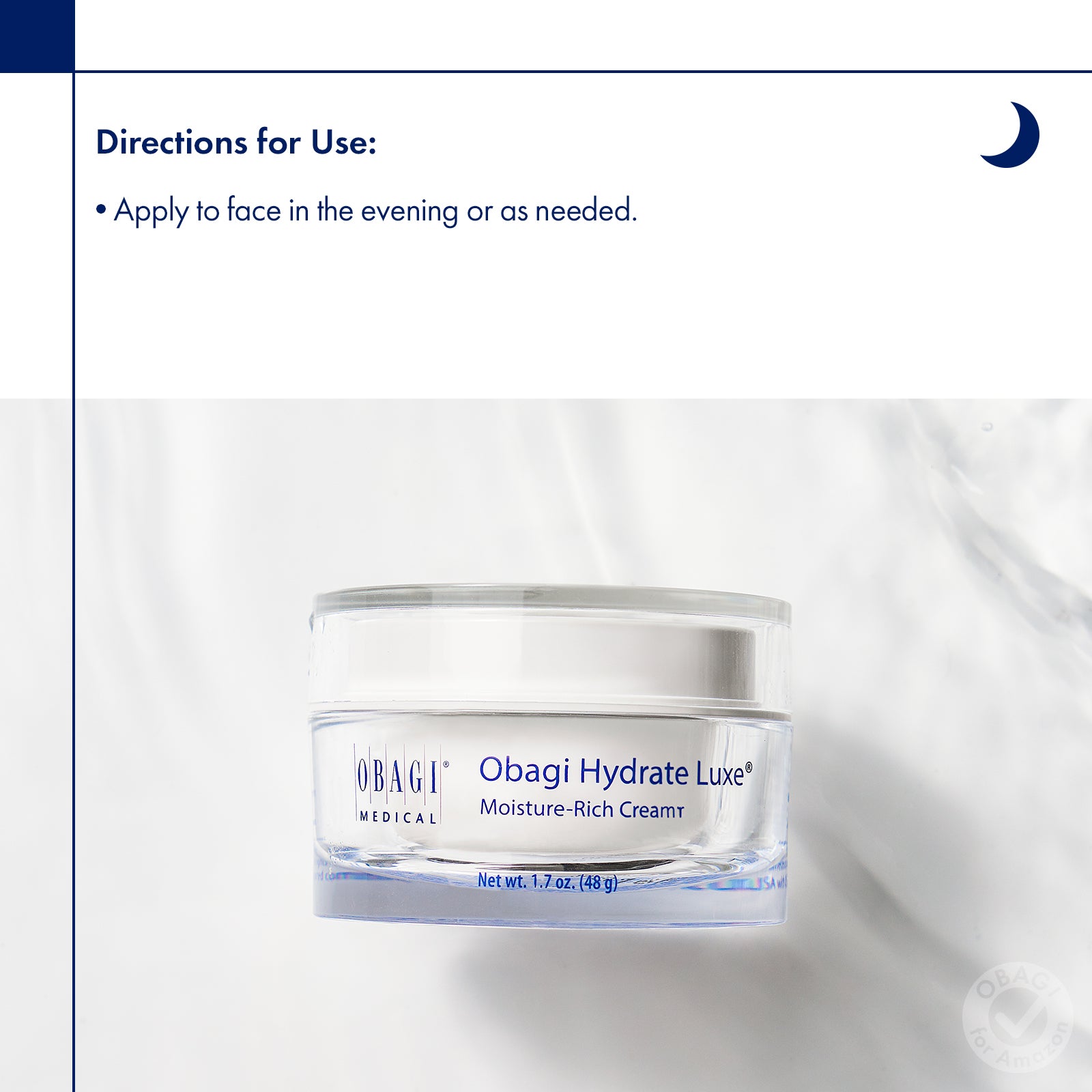 Obagi Hydrate Luxe is an ultra-rich hydrating formula specifically engineered with key Biomimetic Peptides and Tara Seed Extract that both immediately and over time moisturize skin. For intensive hydration and a rejuvenated complexion. Ideal for PM usage.